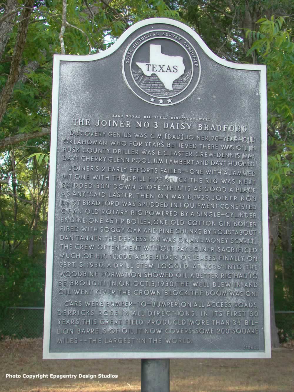 ![]() Marker at Joinerville Texas "Discovery Well ... Joiner No. 3 Daisy Bradford brought in September 3, 1930 as the first producer in the largest oil field in the world" |