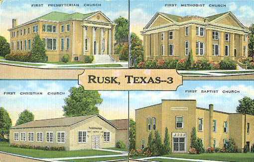 Historic postcard of Rusk, Texas Churches
